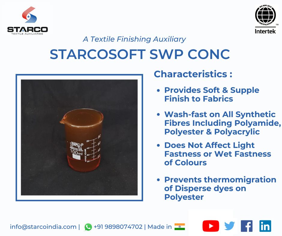 - Starcosoft SWP Conc is a cationic softener offering long-lasting softness and wash durability for polyester, polyamide, and polyacrylic fabrics.